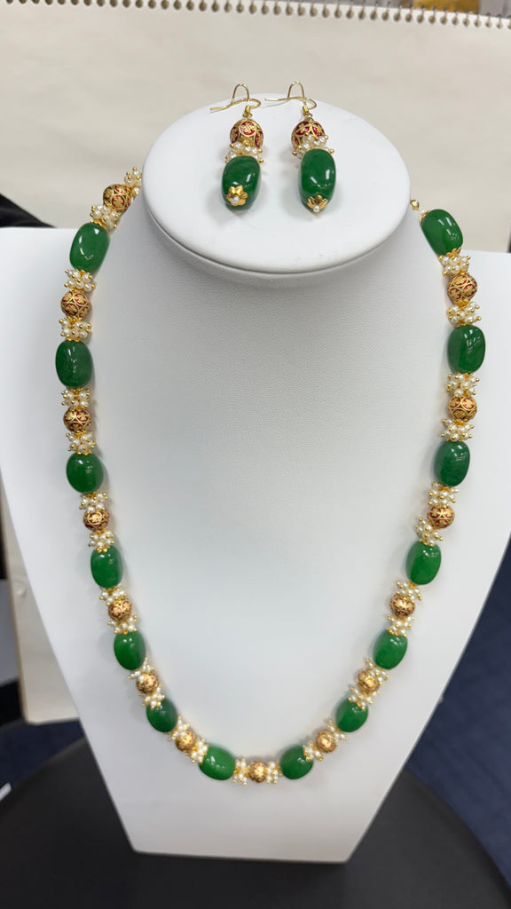 GREEN JADE NUGGETS AND PEARL NECKLACE WITH EARRINGS SET (24K GOLD PLATED BEADS)