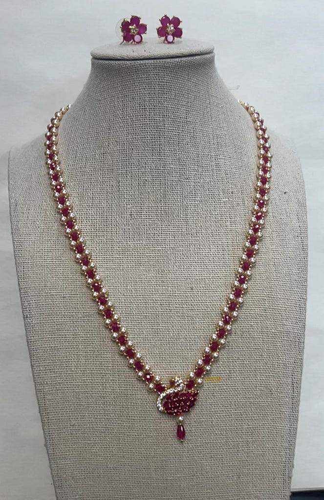 CHETAN RUBY AND SWAROVSKI PEARL NECKLACE WITH EARRINGS SET (24K GOLD COATED BEADS